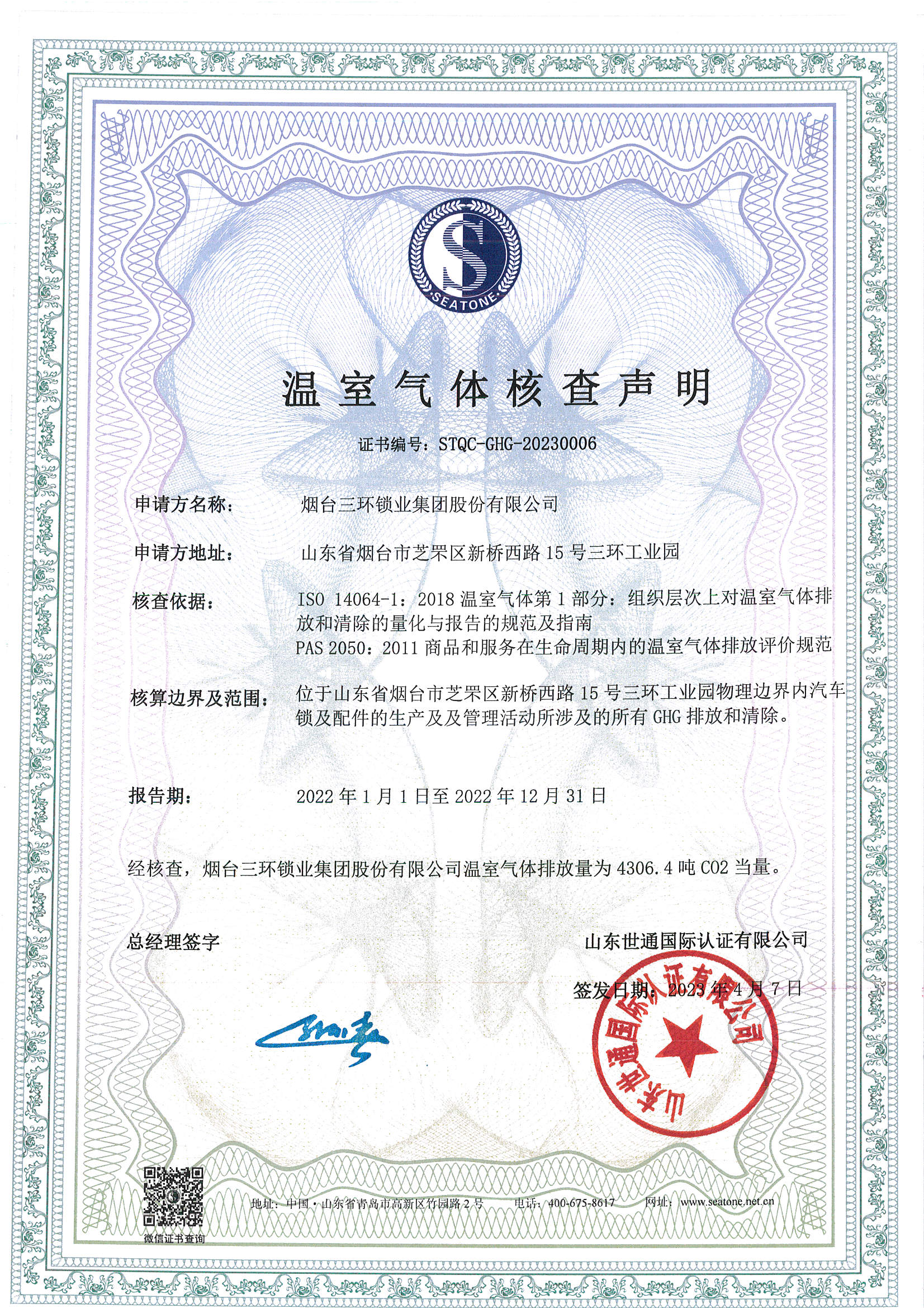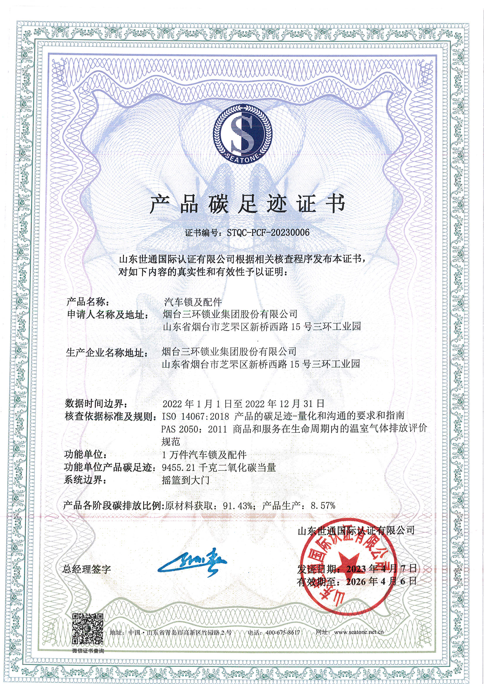 為持續改進提升企業管理水平,向著建設綠色工廠的目標不斷邁進,近日,公司委托山東世通國際認證有限公司(SDQC)按照國際標準化組織(ISO)發布的各項標準規范,遵循生命周期的評價原則,對汽車鎖及配件產品的溫室氣體排放進行了從搖籃到大門的碳排放計算,發布了該產品碳足跡證書和溫室氣體核查聲明。