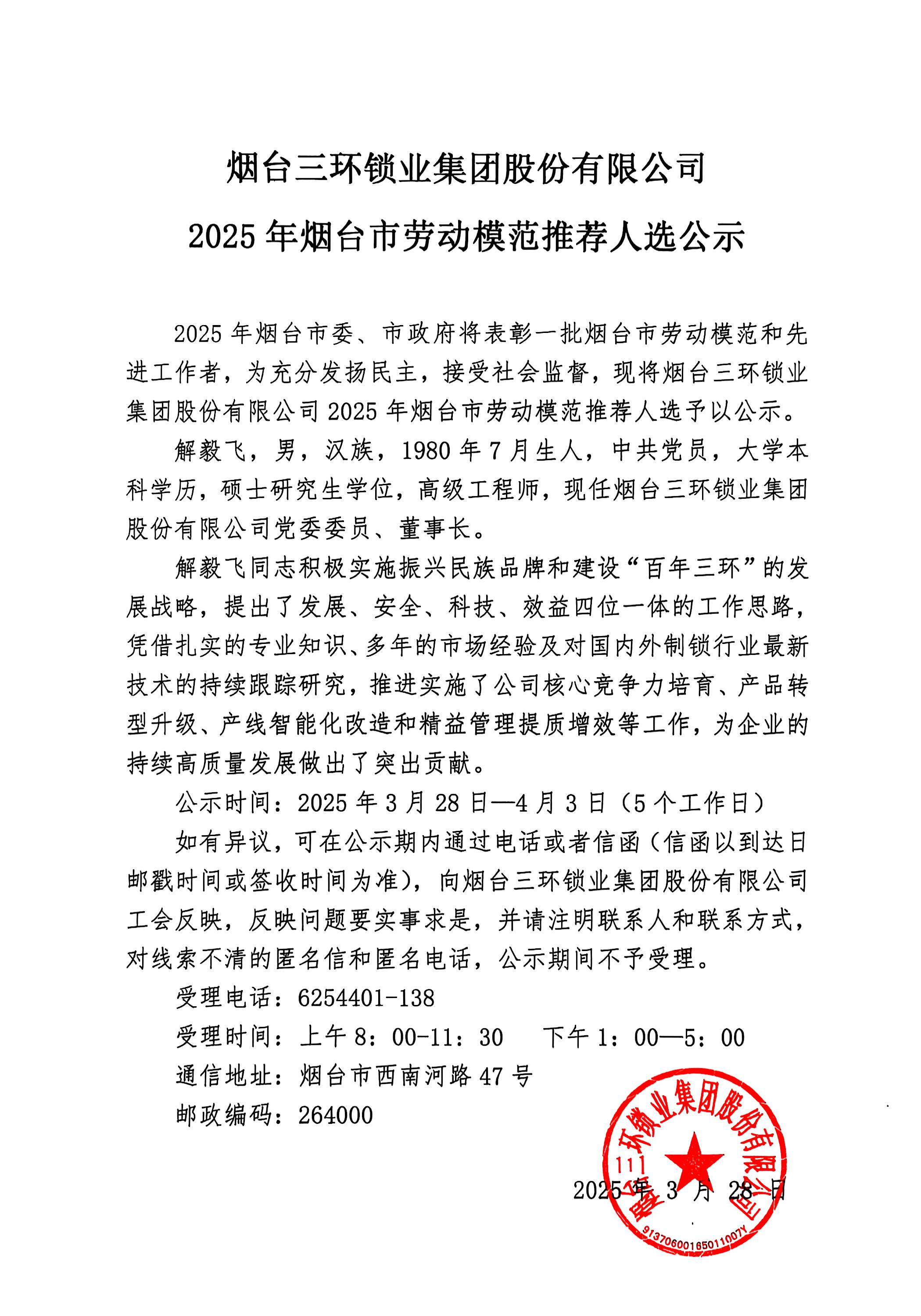 煙臺三環鎖業集團股份有限公司 2025年煙臺市勞動模范推薦人選公示